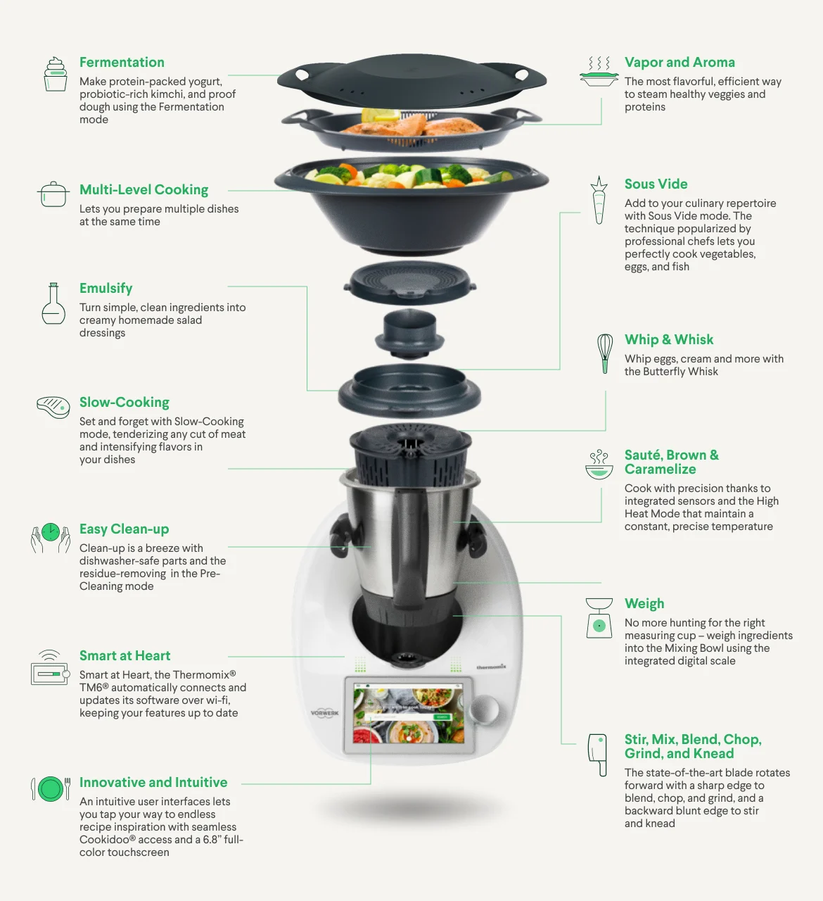 The Thermomix® TM6® redefines the art of cooking, blending innovation, versatility, and convenience into a single powerhouse appliance. Elevating your culinary experience to new heights, the TM6 seamlessly combines 20 different appliances in one sleek unit, bringing you unparalleled convenience and creativity in the kitchen.